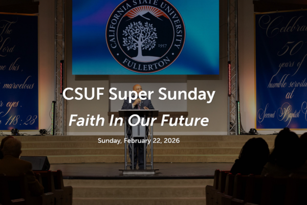 For more than 20 years, the CSU has partnered with predominantly Black and African American faith-based organizations to host Super Sunday, a time-honored tradition promoting faith, belonging, equity, and opportunity. CSUF leaders and students share authentic stories that inspire and deliver empowering messages about the importance of college preparation and the accessibility of higher education. Through these long-lasting partnerships, we strive to uplift future generations and support the success of all students.